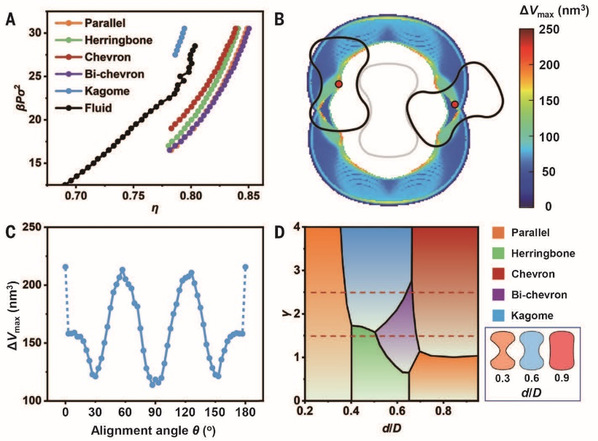 理论计算表明,非密堆积的Kagome超晶格是热力学稳定相,新加坡南洋理工大学倪冉教授团队通过模拟分析证实其稳定性源自曲率介导的排空吸引力。在此分析基础上,研究团队进一步简化模型,构建出了哑铃形颗粒超晶格的结构理论预测框架,为深入理解非凸纳米颗粒的自组装行为提供了重要的理论依据。