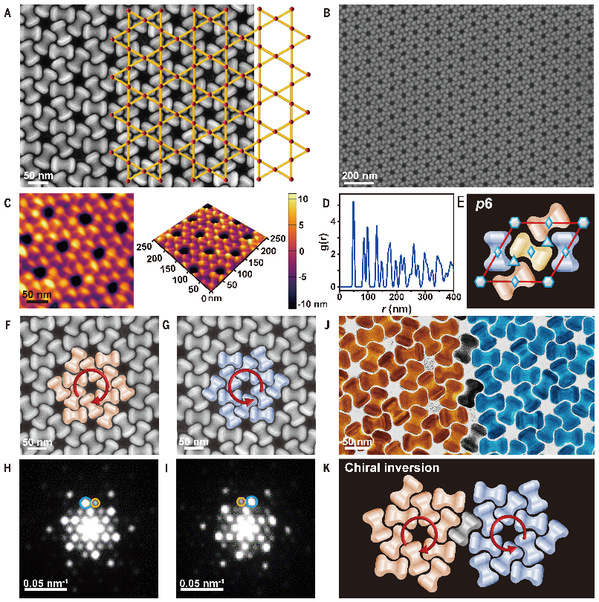 该研究通过优化合成条件制备了凹度适中的哑铃形颗粒,并基于气液界面组装技术,获得了高质量的二维Kagome超晶格,其单晶区域可达数十平方微米,包含超过10万个凹凸互锁的哑铃形颗粒。“这种精度是传统3D打印和光刻技术难以比拟的,再次展现了纳米自组装技术在物质制备中的优势。”李同涛说。该Kagome超晶格具有p6对称性,展现出独特的面内手性,有望带来全新的光学性质。